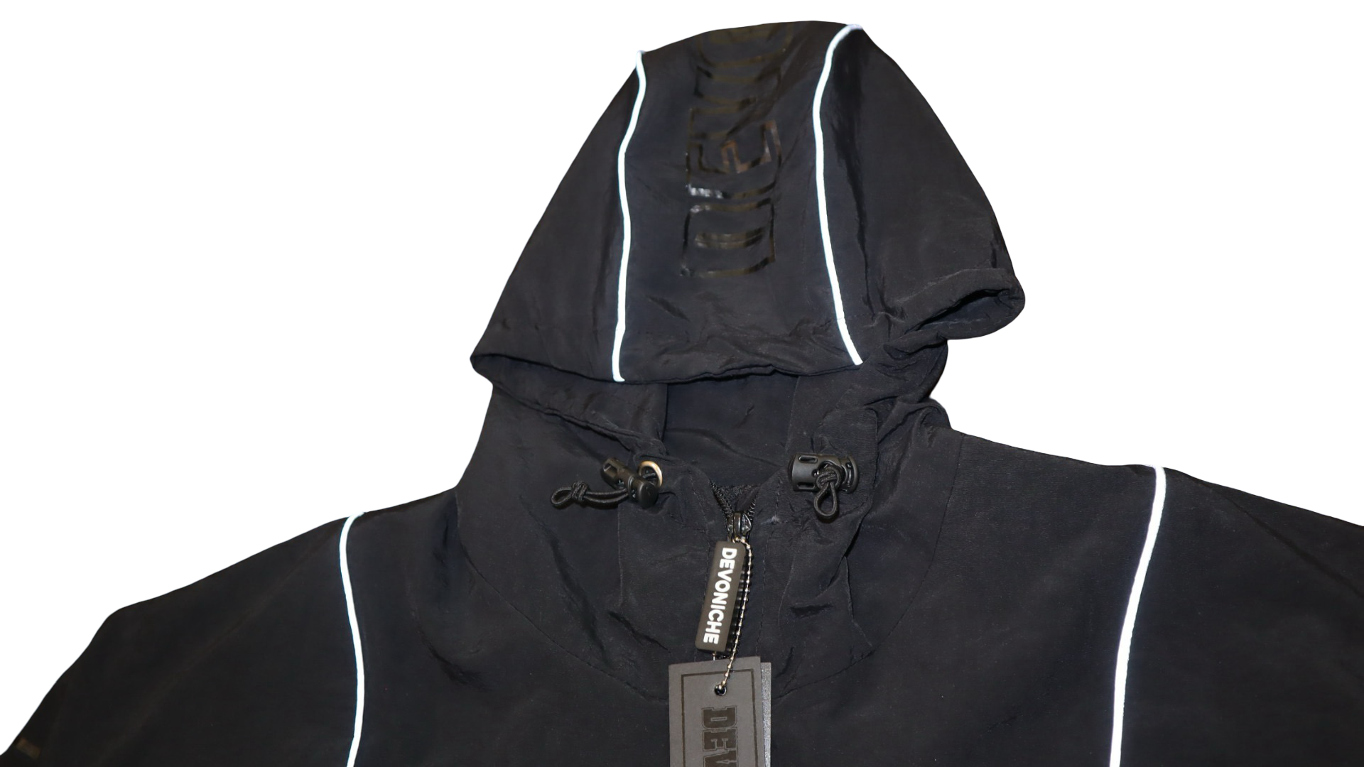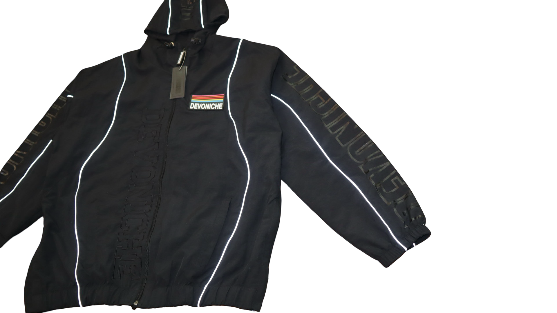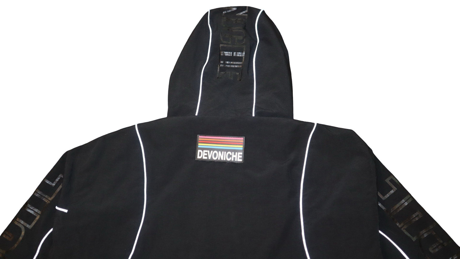 Signature Branding: Features high-density "DEVONICHE" screen-printed lettering across the sleeves, torso, and hood.